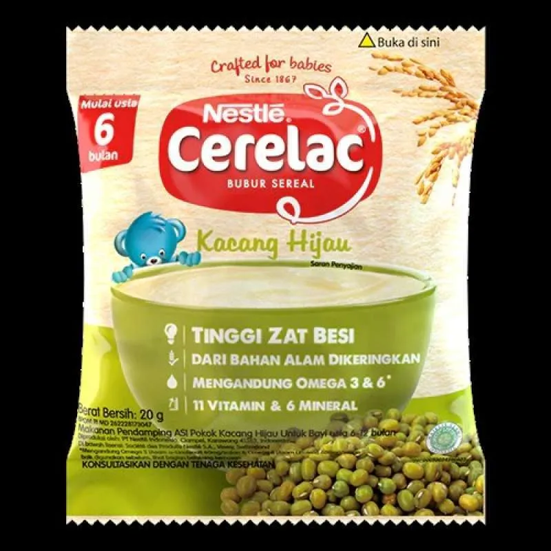Cerelac Kacang Hijau adalah makanan pendamping ASI (MPASI) instan yang diformulasikan khusus untuk memenuhi kebutuhan nutrisi harian bayi. Terbuat dari kacang hijau pilihan yang diperkaya dengan zat besi, vitamin, serta mineral penting untuk mendukung pertumbuhan dan perkembangan optimal. Teksturnya lembut, mudah dicerna, dan memiliki rasa alami yang disukai bayi. Praktis disajikan dan aman tanpa tambahan pengawet.