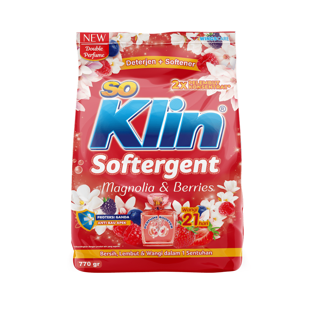 Deterjen bubuk plus pelembut pakaian dalam satu kemasan, efektif untuk membersihkan noda membandel sekaligus membuat pakaian lebih lembut dan harum. Klin Softergent 245g praktis digunakan untuk kebutuhan rumah tangga maupun usaha laundry.